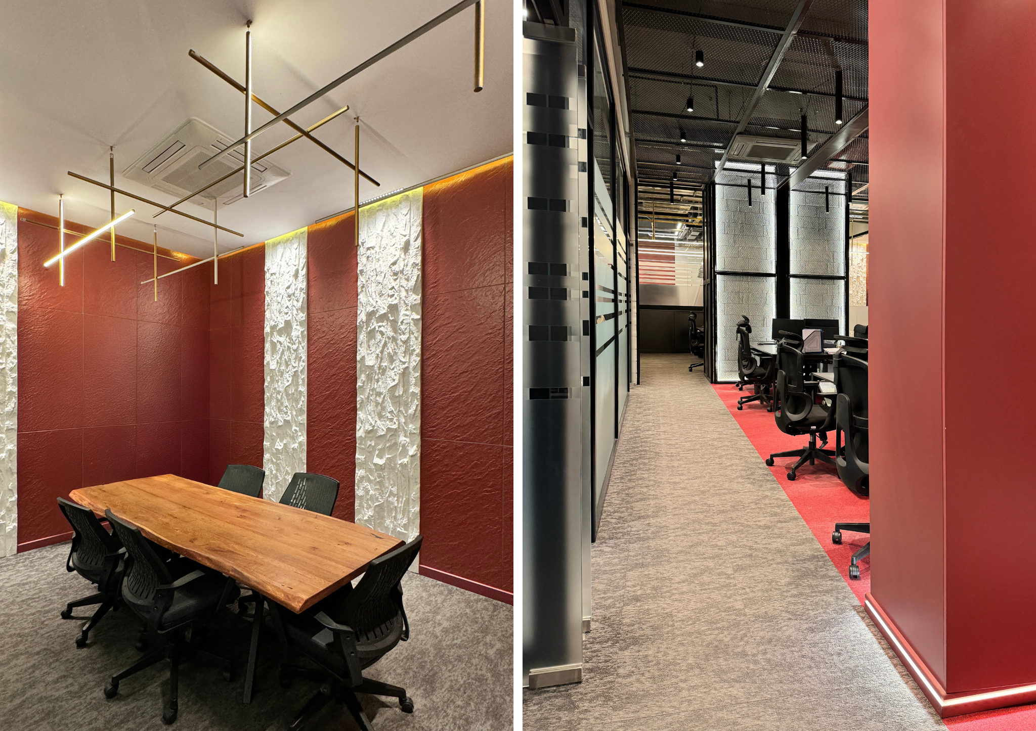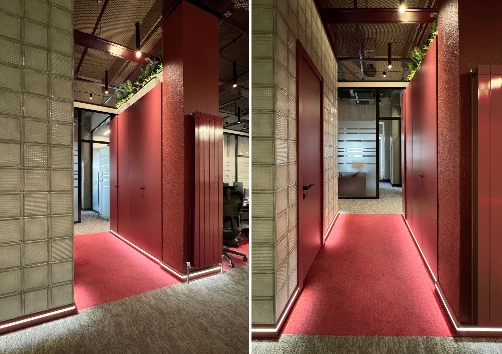 Візуальний образ кімнати переговорів сформований чотирма складовими. Багряний колір стін — відсилання до образу країни вогнів. У поєднанні з підсвіченими рельєфними панелями він символізує енергію компанії та внутрішню силу, що не згасає.