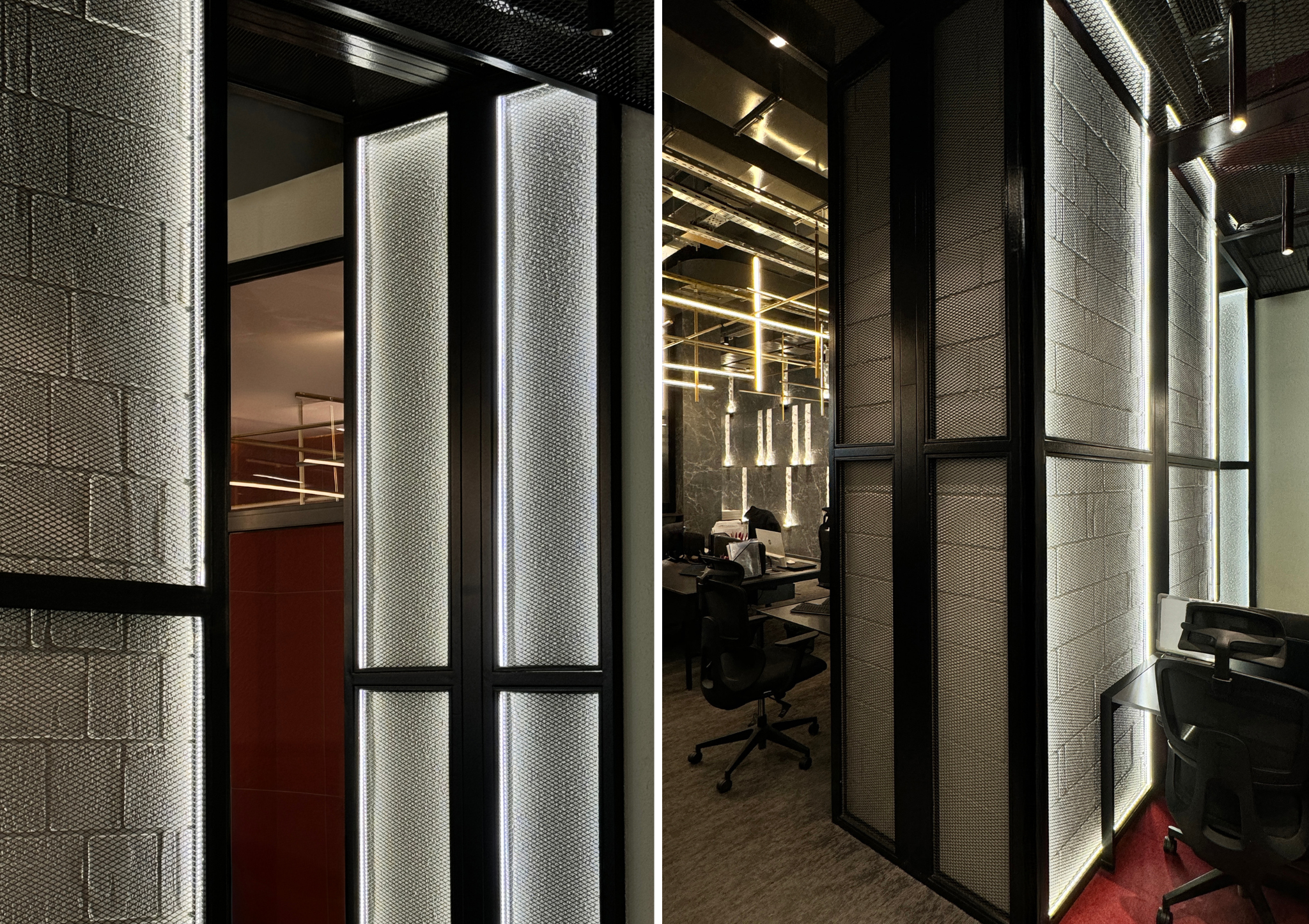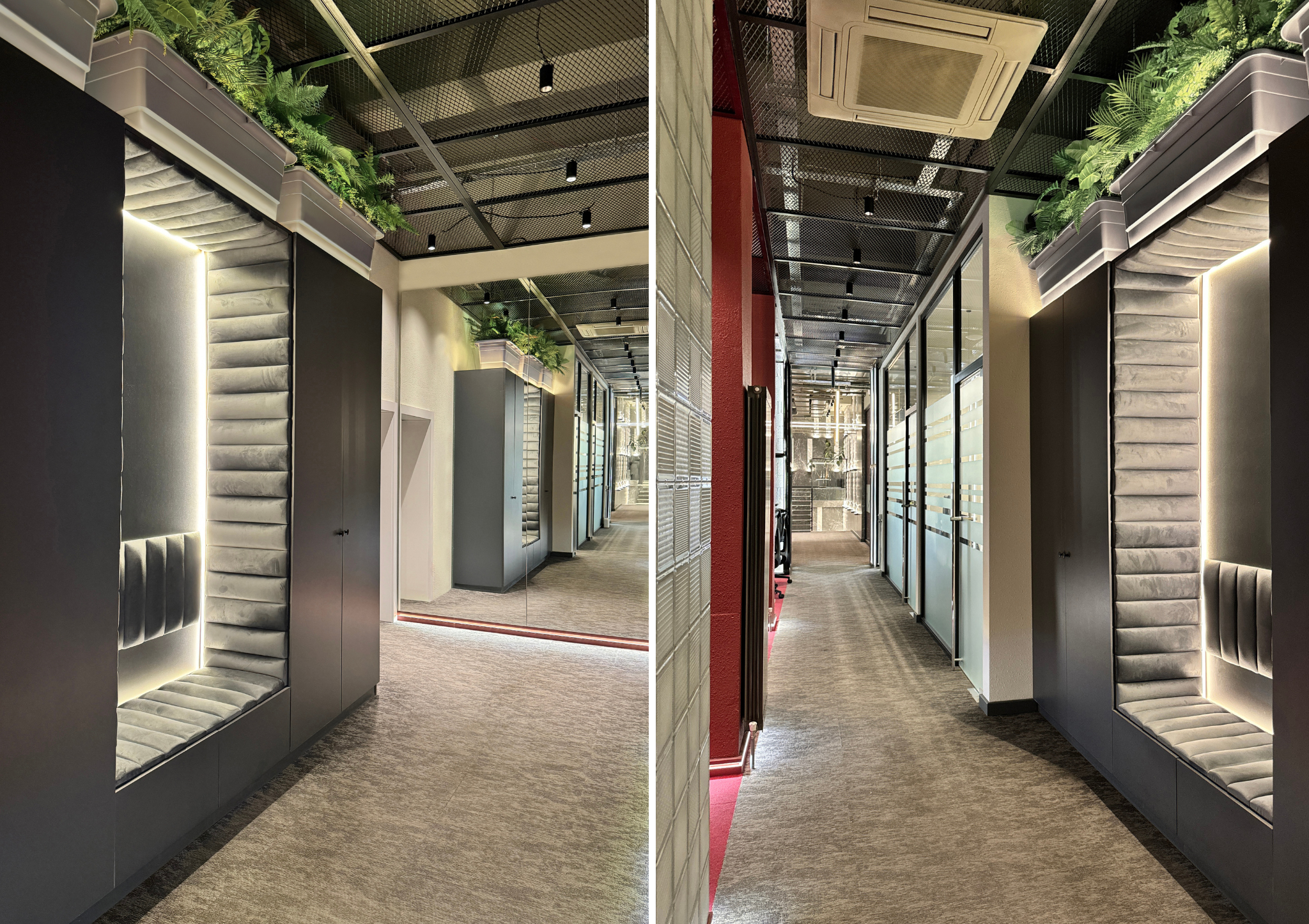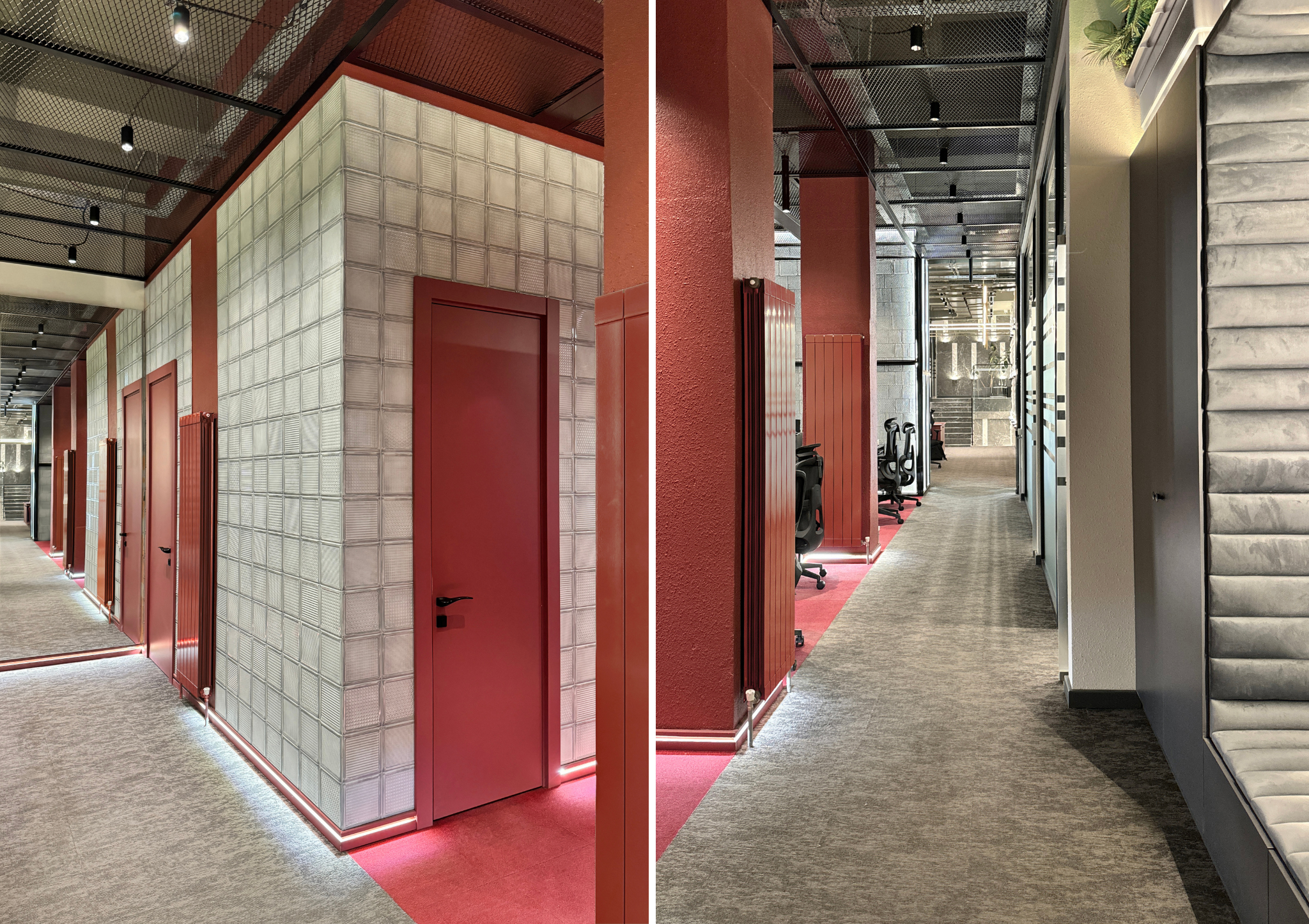 Матеріали, які виробляє та постачає компанія, інтегровані й в інтер’єр як елементи оздоблення. Металеві решітки, відкриті комунікації та велика кількість підсвіток формують виразний індустріальний характер простору.