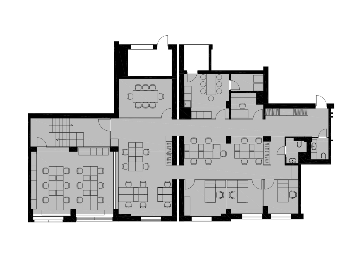 Від сходів розкривається основний опен-спейс, в якому розташовані робочі місця співробітників компанії. Великий простір є перетином трьох функціональних зон — візуальним продовженням кімнати для переговорів, меншого опен-спейсу та робочого приміщення на антресолі.