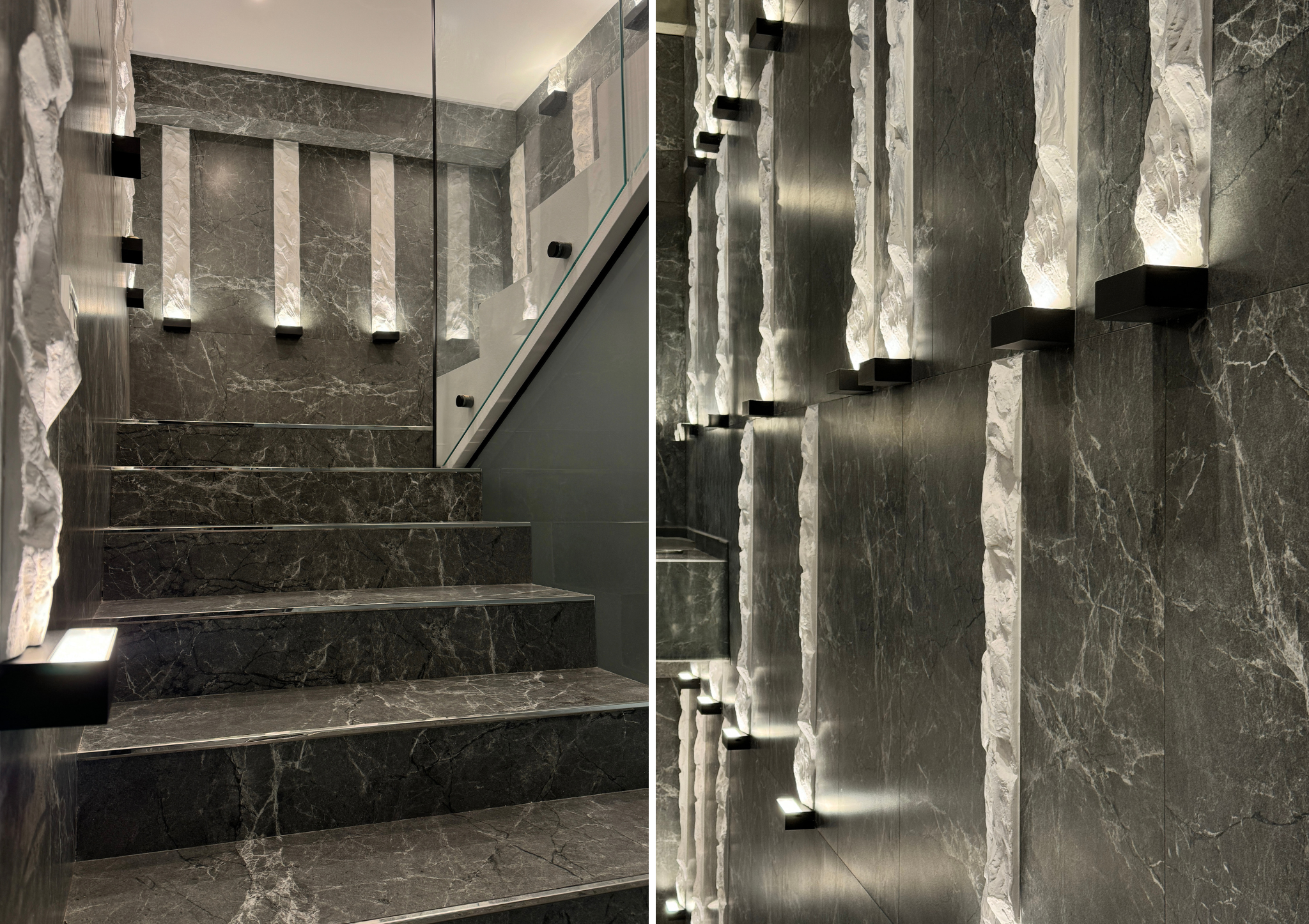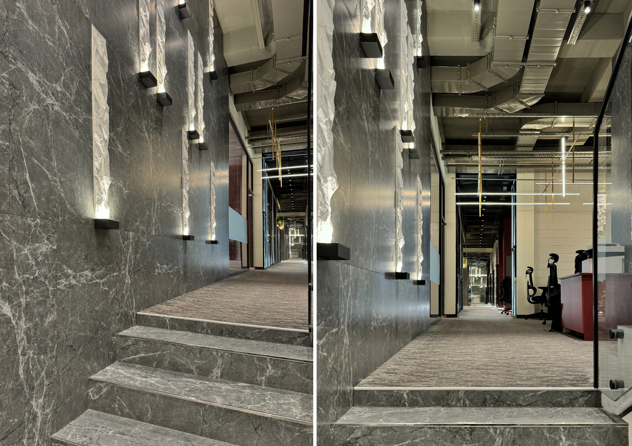 Структурний світильник виступає метафорою логістики й комплексного підходу, а тактильний дерев’яний стіл, обраний відповідно до побажань замовника, створює контекст довіри, відповідальності та балансу з природою — у контрасті до каменю, металу й скла.