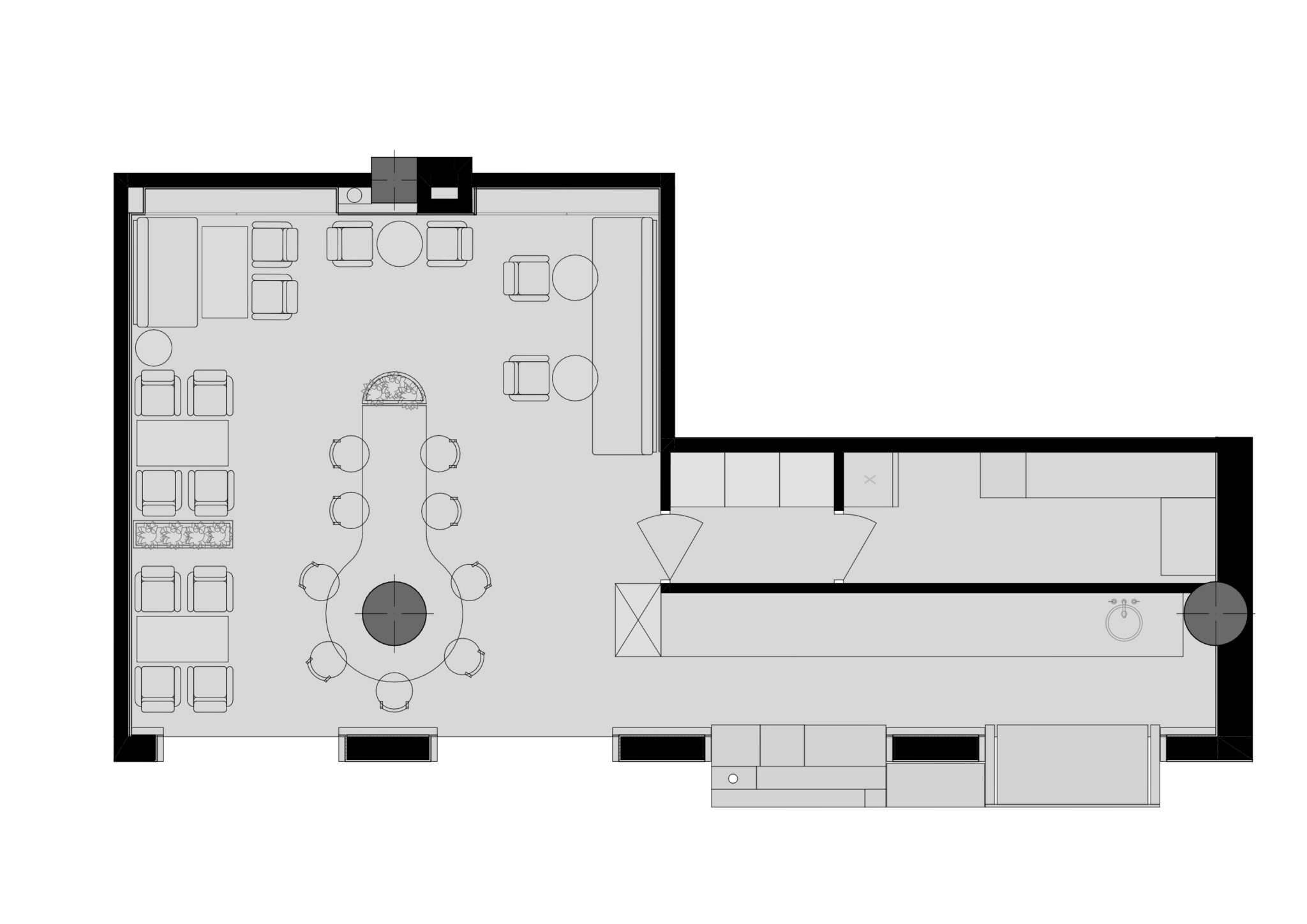 Зал облаштували різними типами посадки — м’який кут з диванами для відпочинку, столи для зручного прийому їжі та висока острівна посадка — комунальна барна стійка для спілкування компанії.