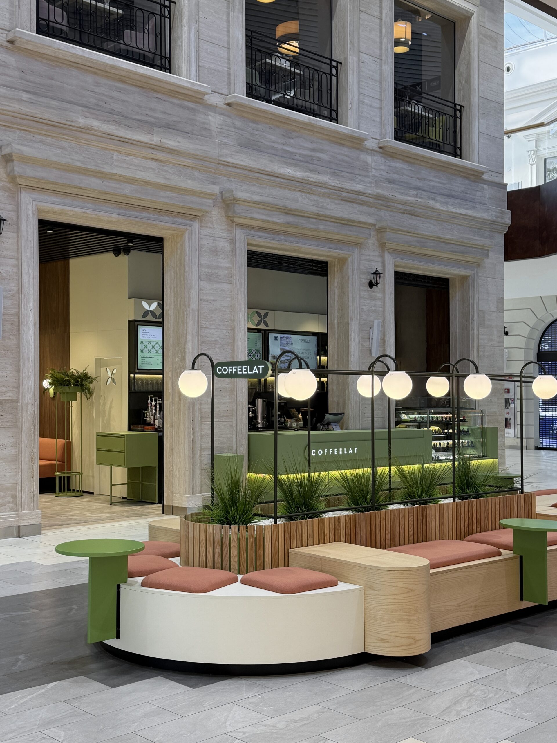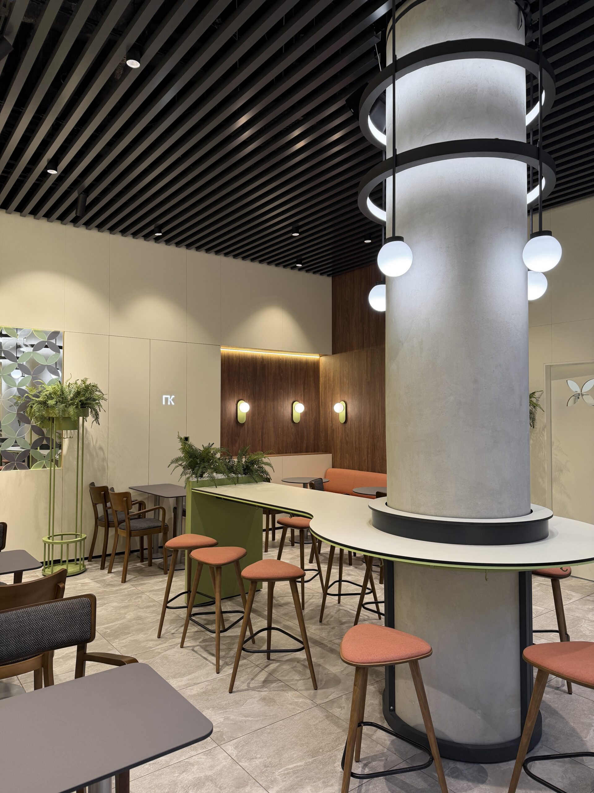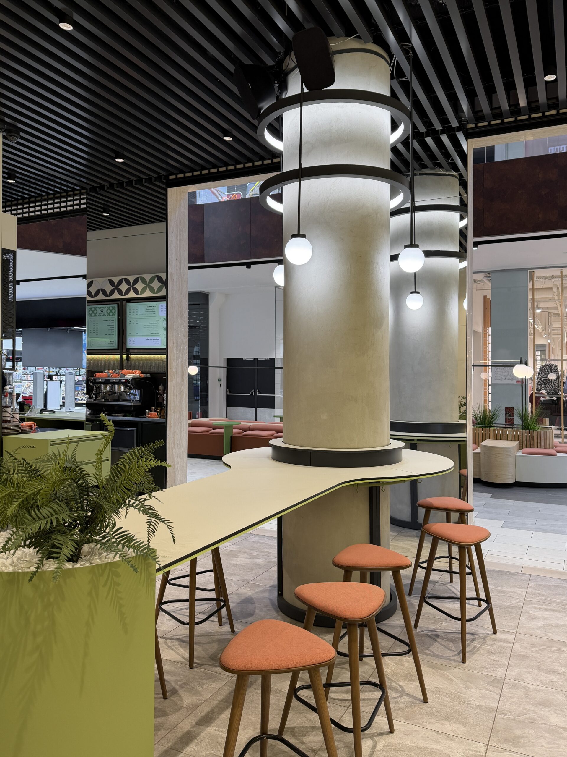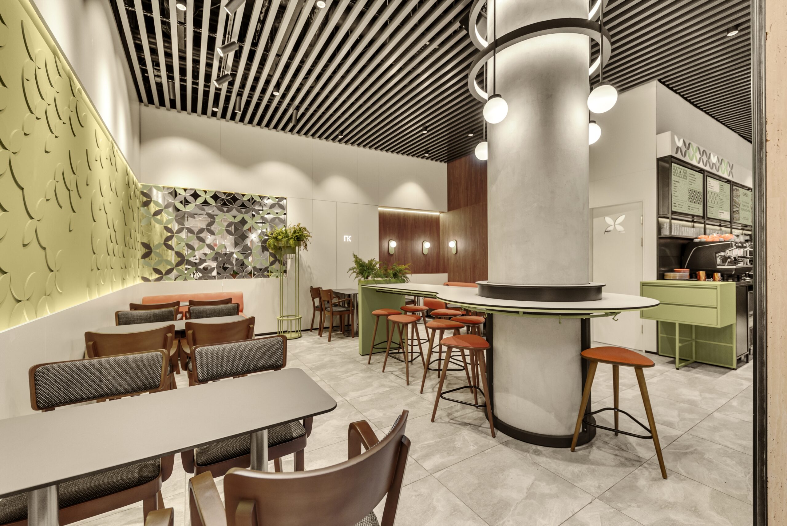 Посадку зробили різноманітною — м’який кут з диванами для відпочинку, столи для зручного прийому їжі та висока острівна посадка, влаштована навколо конструктивної колони, стала візуальним центром приміщення. Оновлений образ Coffеelat є емоційним майбутнім бренду.