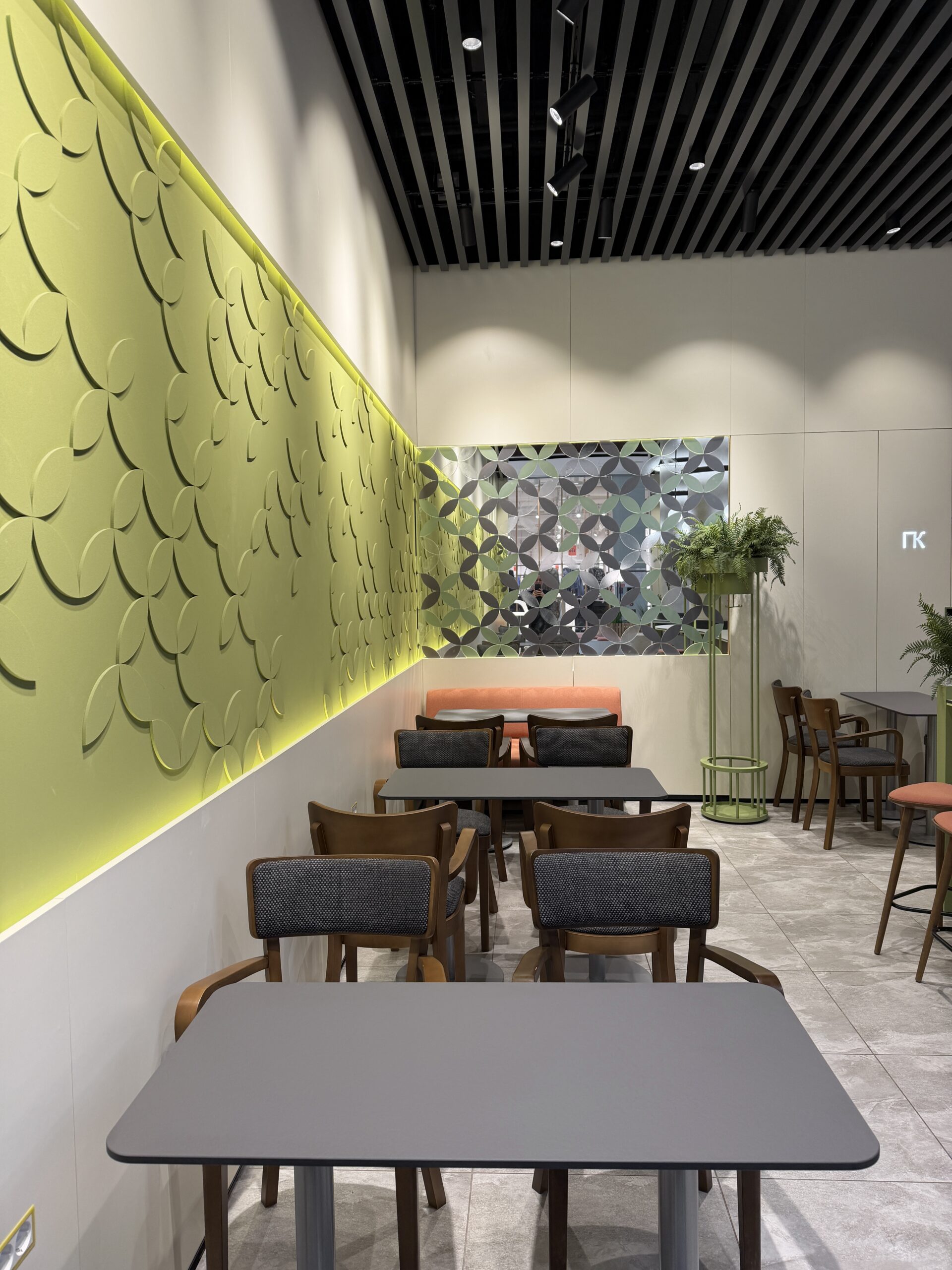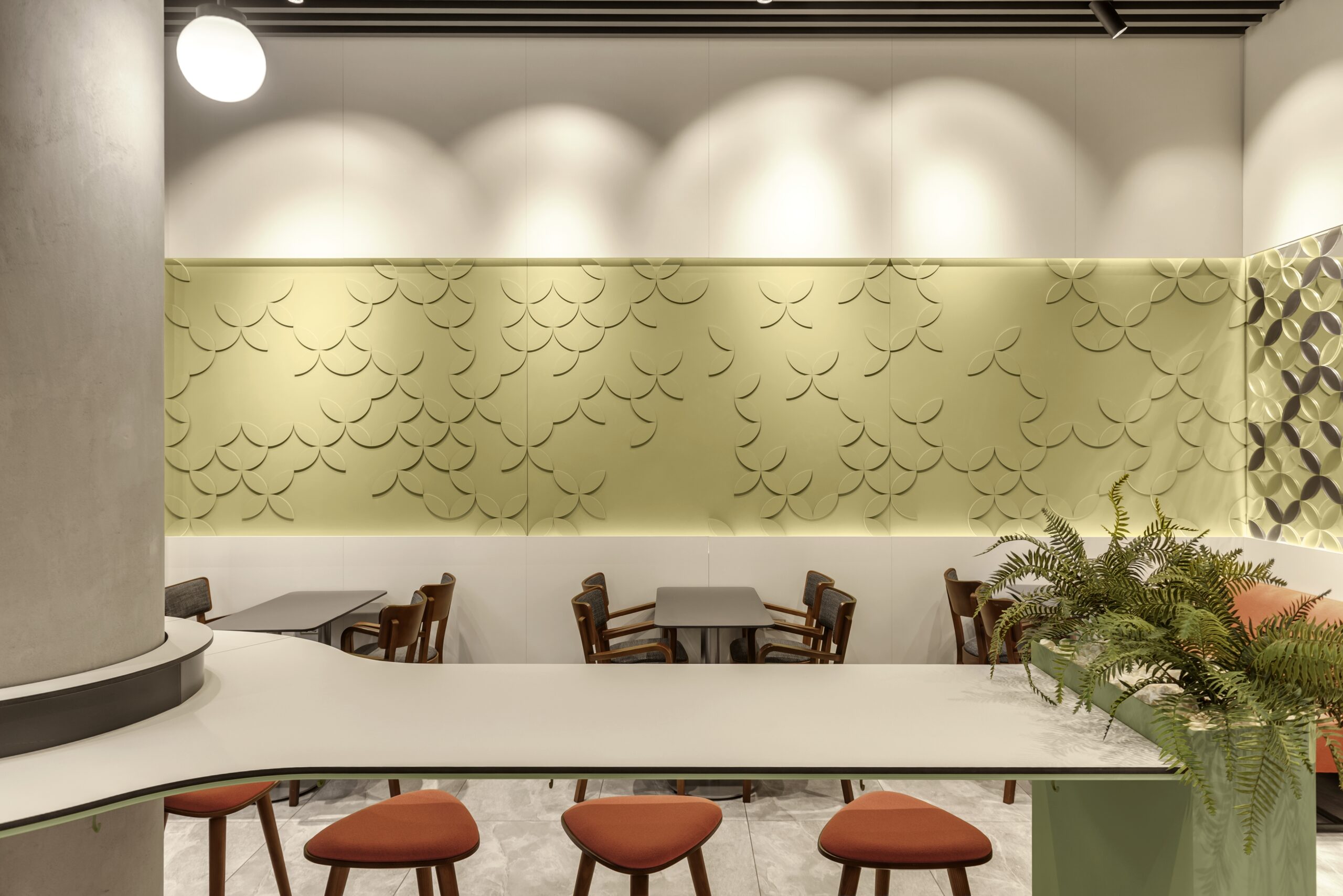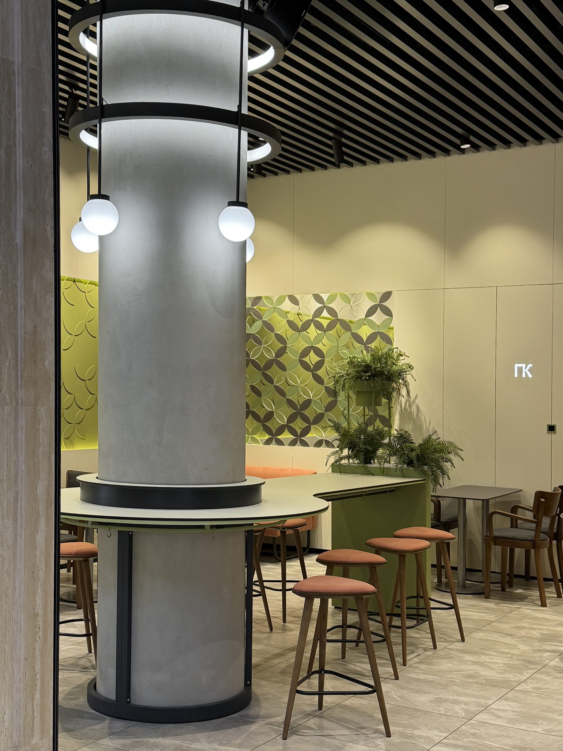 Посадку зробили різноманітною — м’який кут з диванами для відпочинку, столи для зручного прийому їжі та висока острівна посадка, влаштована навколо конструктивної колони, стала візуальним центром приміщення. Оновлений образ Coffеelat є емоційним майбутнім бренду.