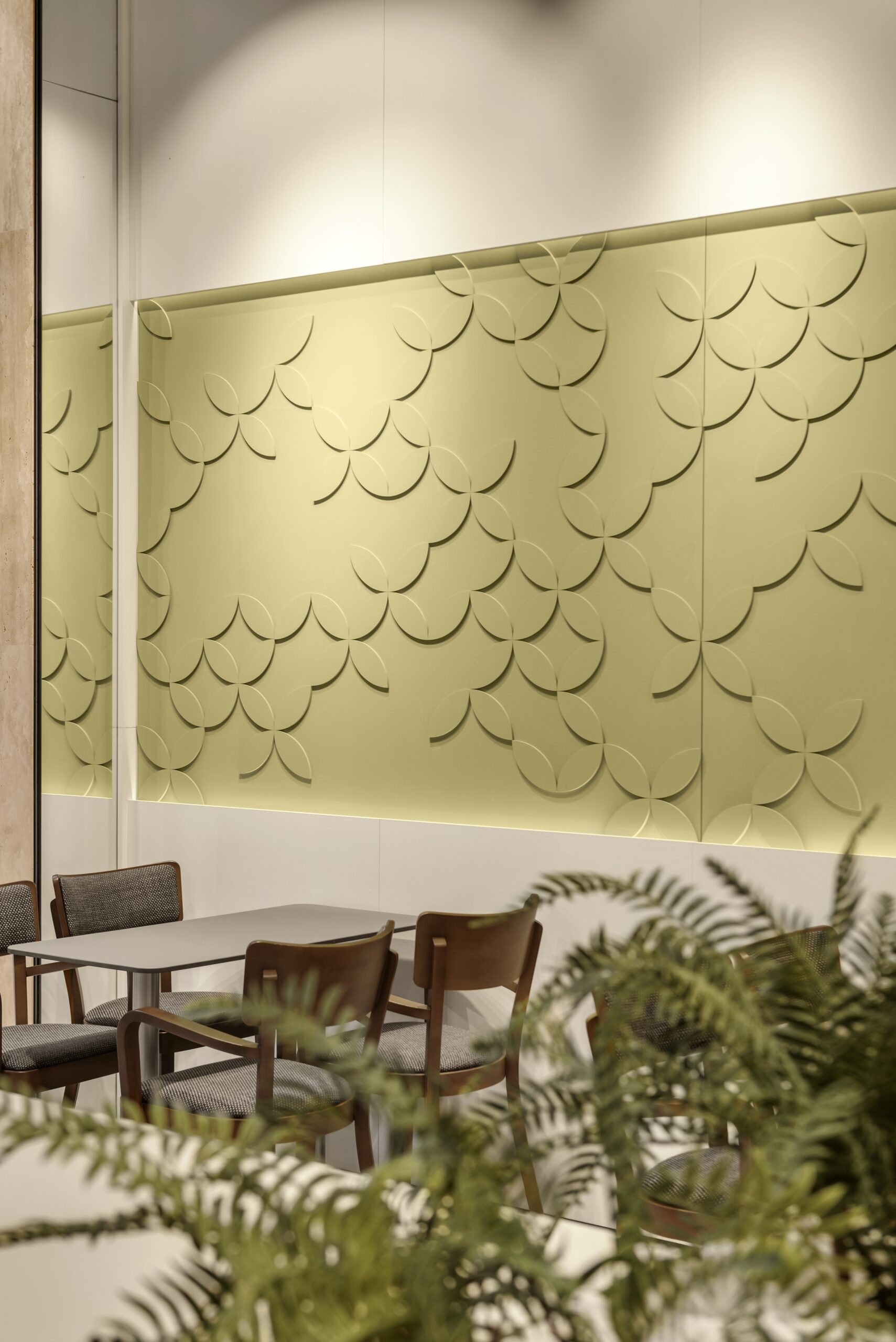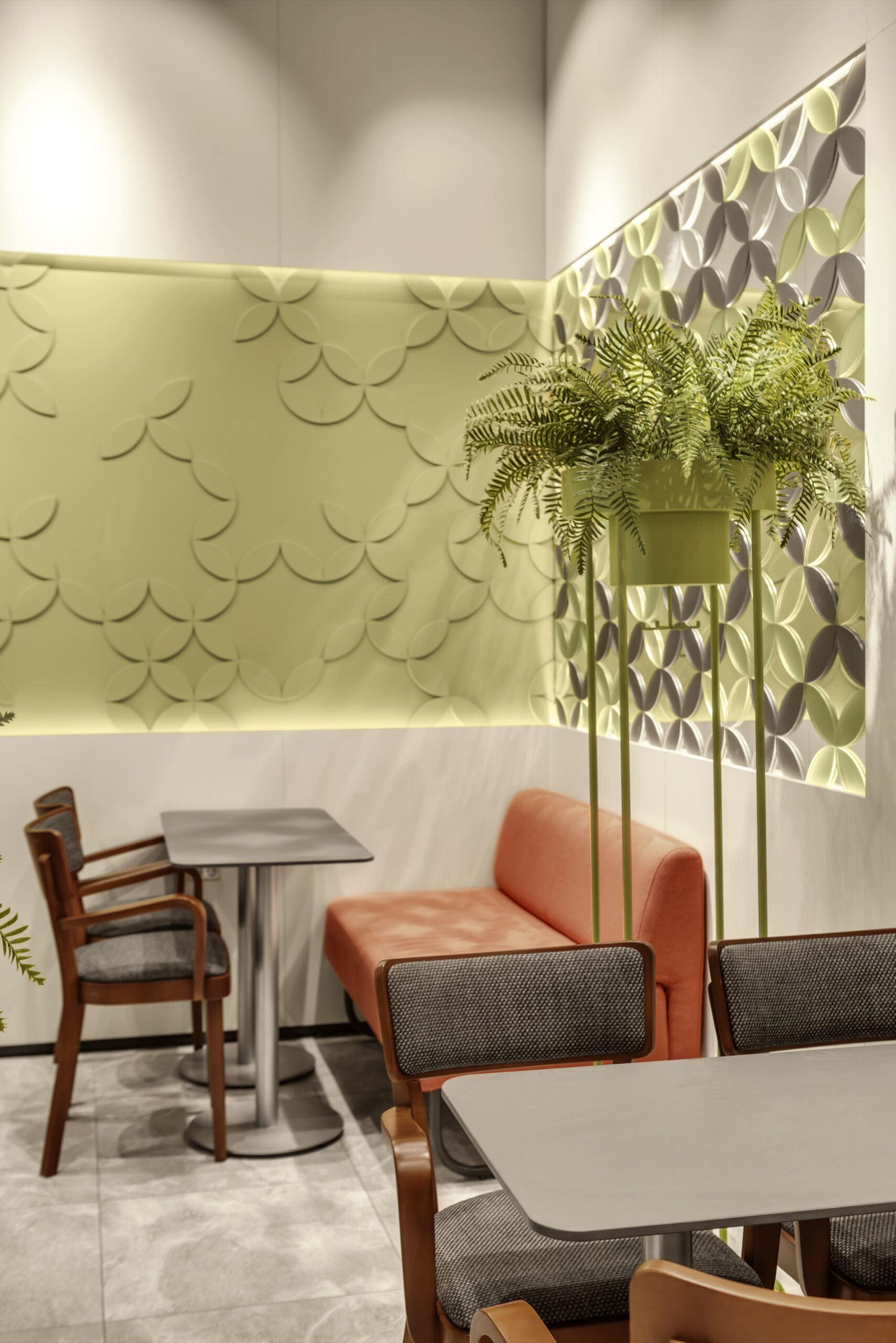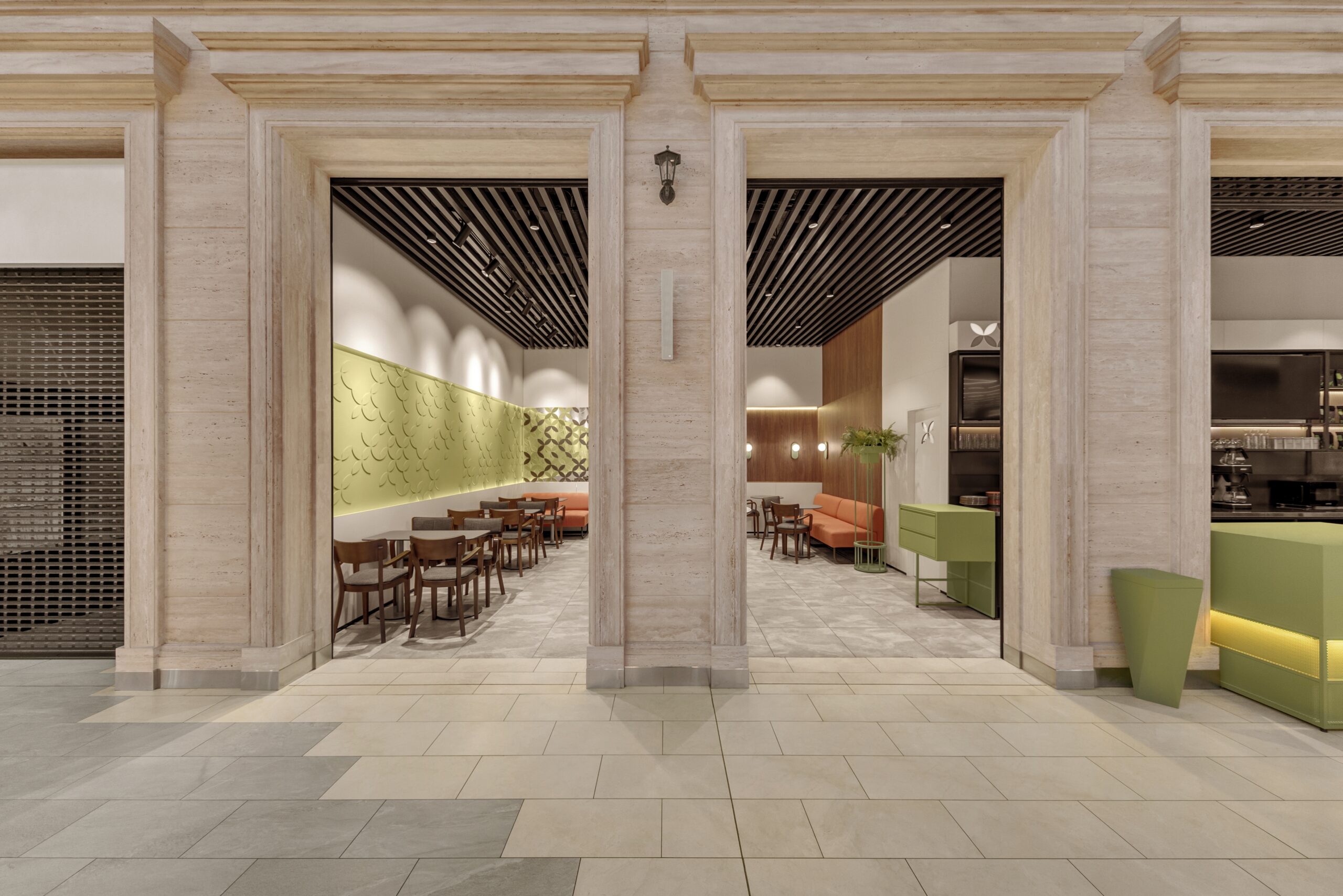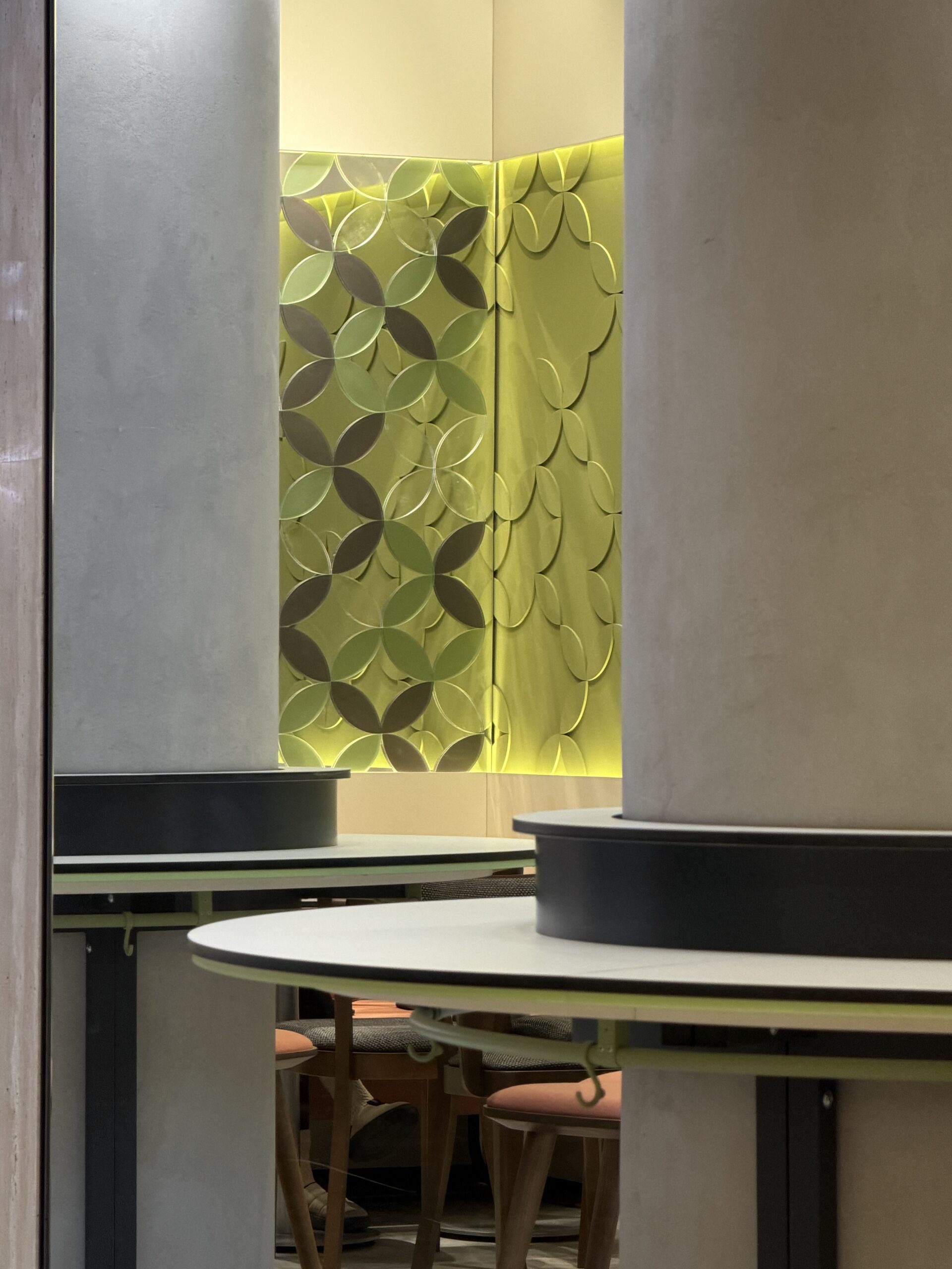 Посадку зробили різноманітною — м’який кут з диванами для відпочинку, столи для зручного прийому їжі та висока острівна посадка, влаштована навколо конструктивної колони, стала візуальним центром приміщення. Оновлений образ Coffеelat є емоційним майбутнім бренду.