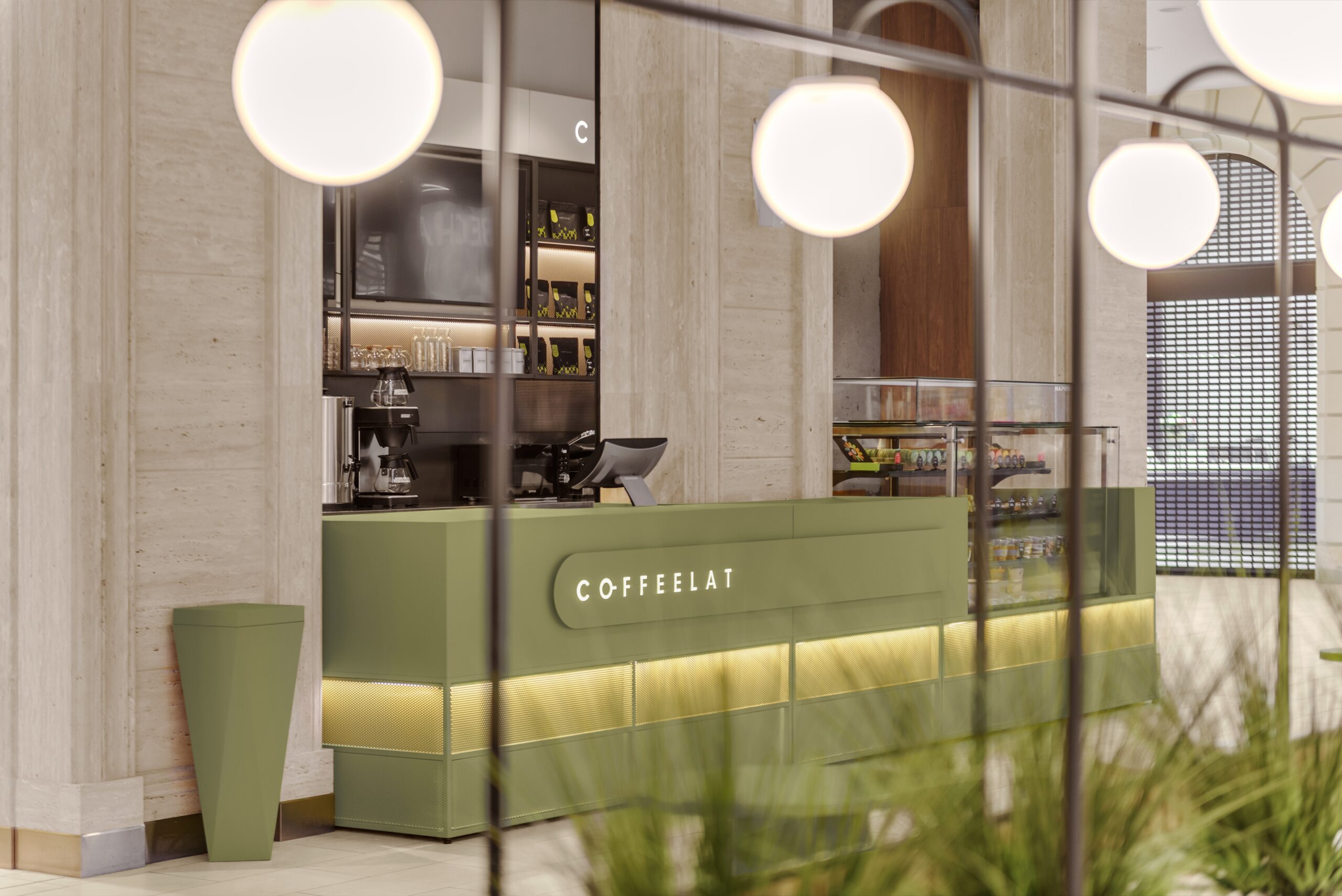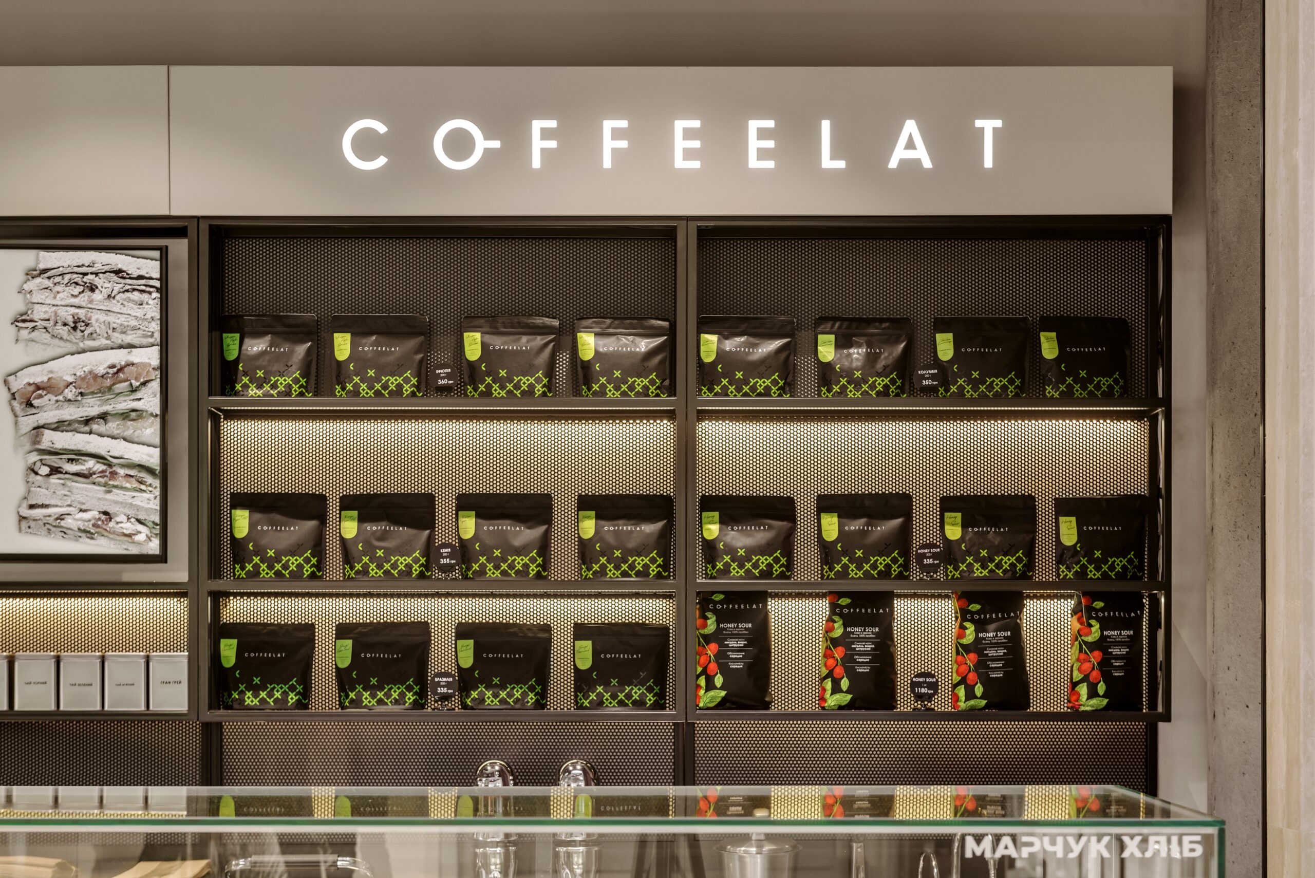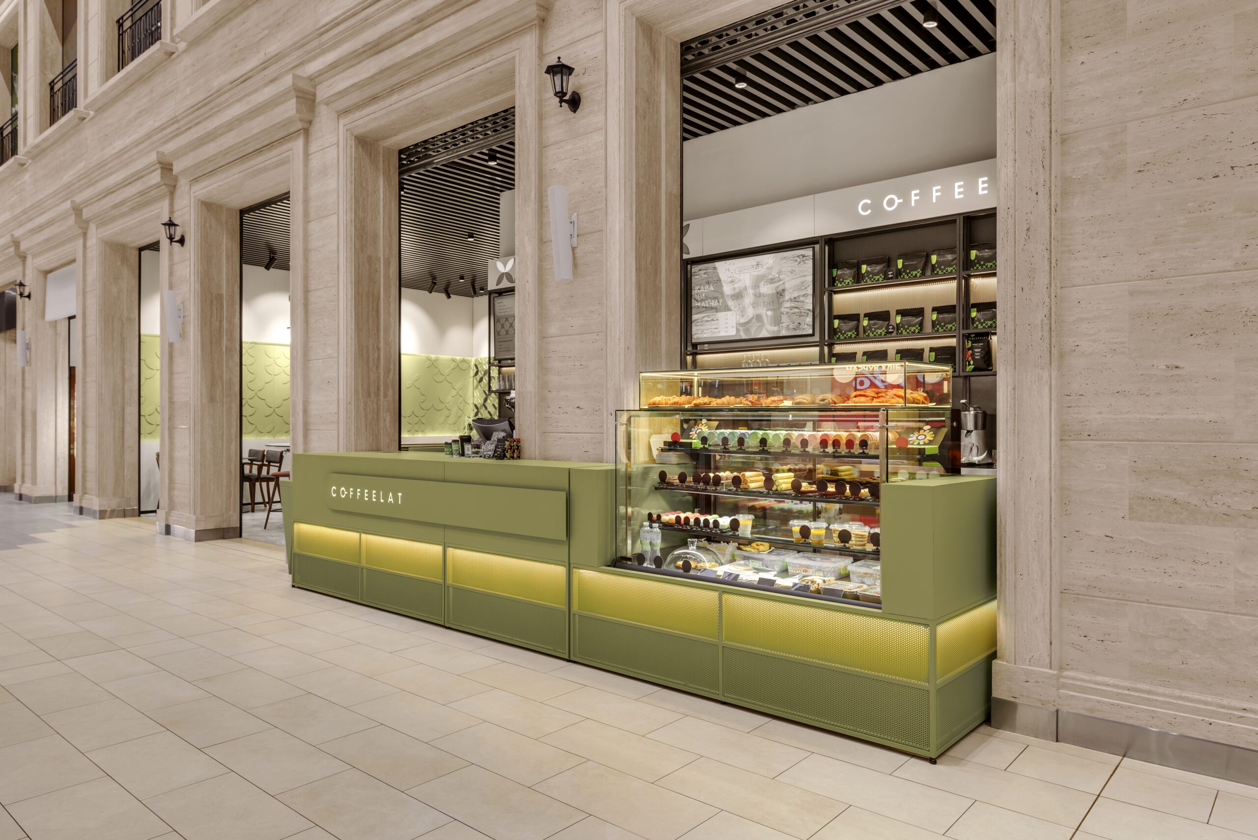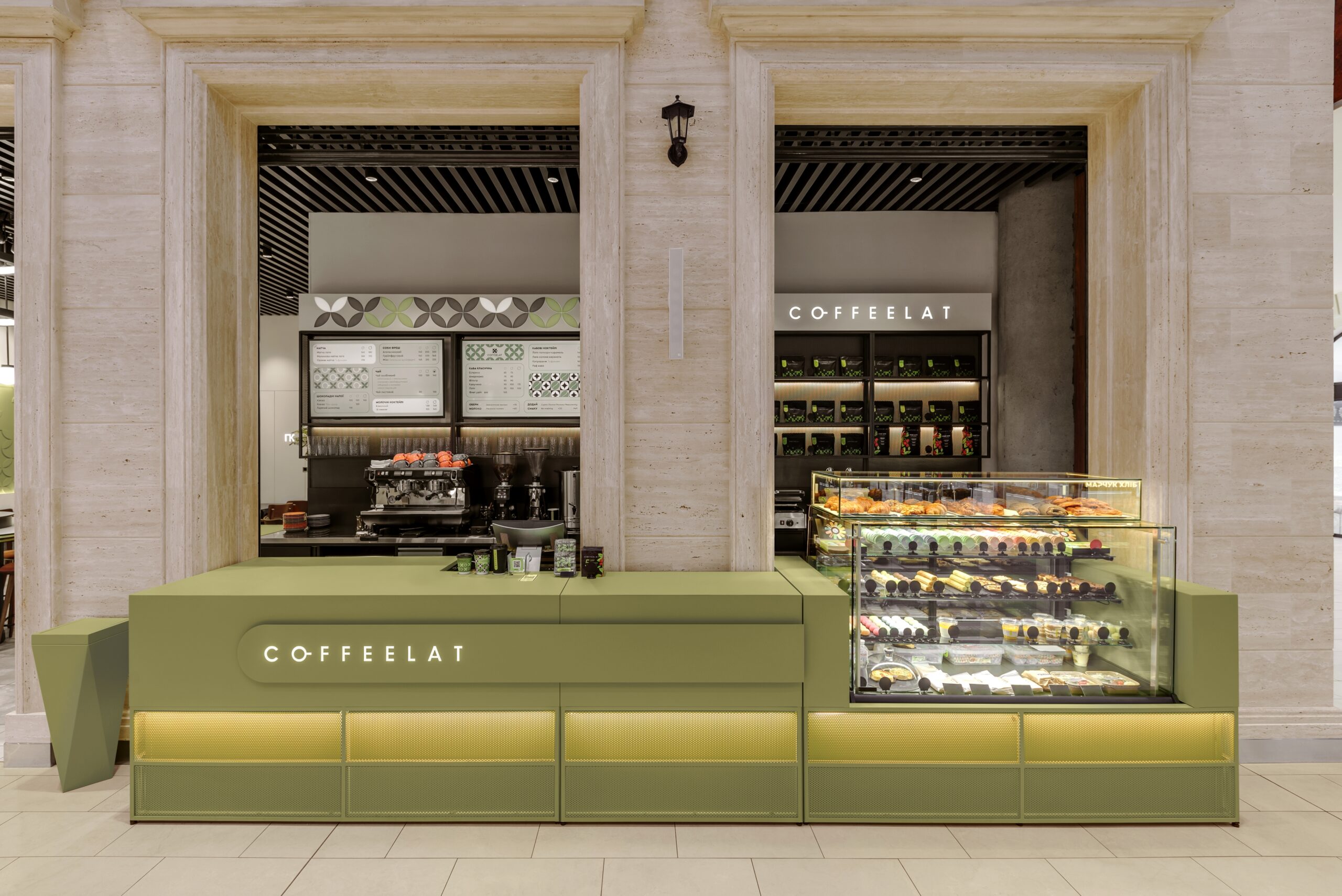 Колір бренду оновили — свіжий зелений — колір натуральної, несмаженої кави, колір матча. Форма — мінімалістична, вітрини — елегантні, акцент — на продукт, все функціонально, не агресивно, прозоро і відкрито. Пропрацювали деталі — дрібні декори у поєднанні з дзеркалами створили цікаву гру ефектів.