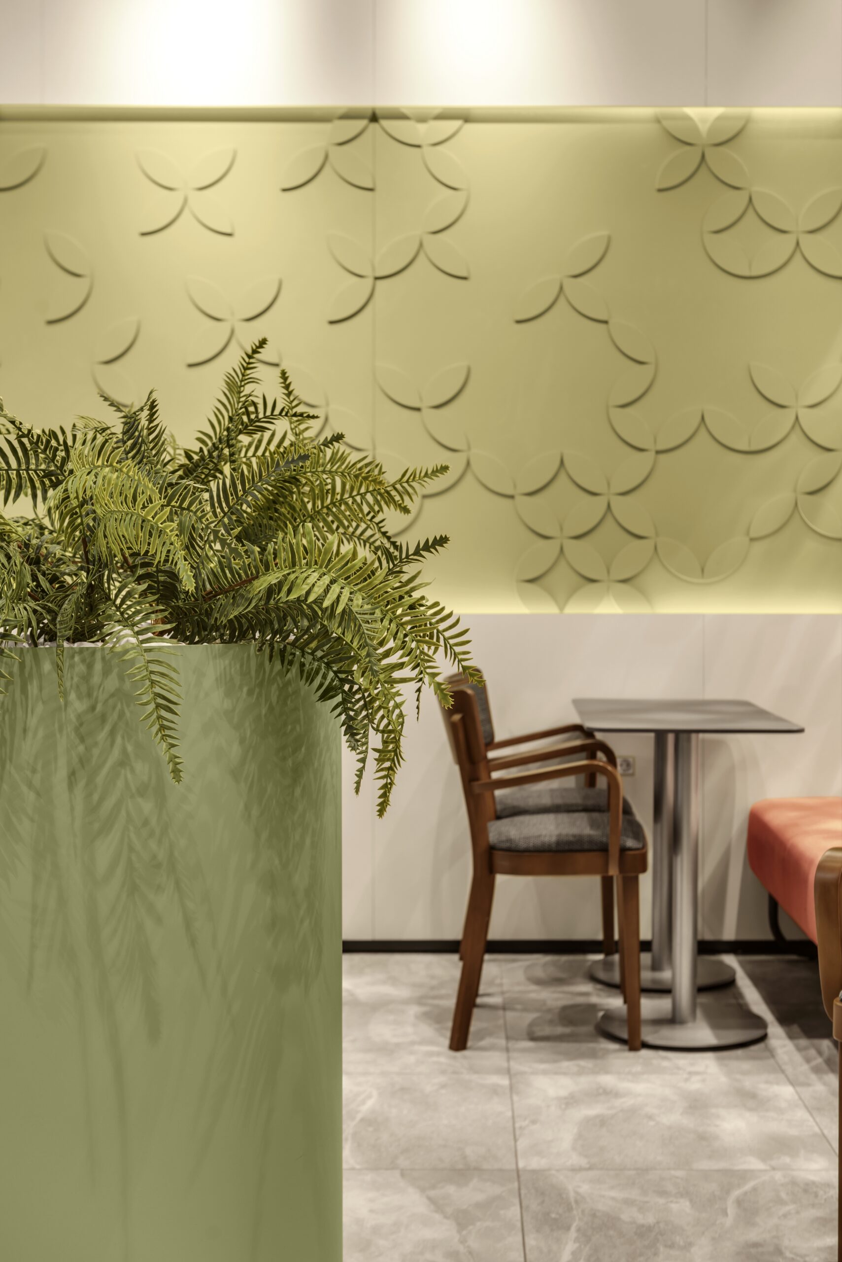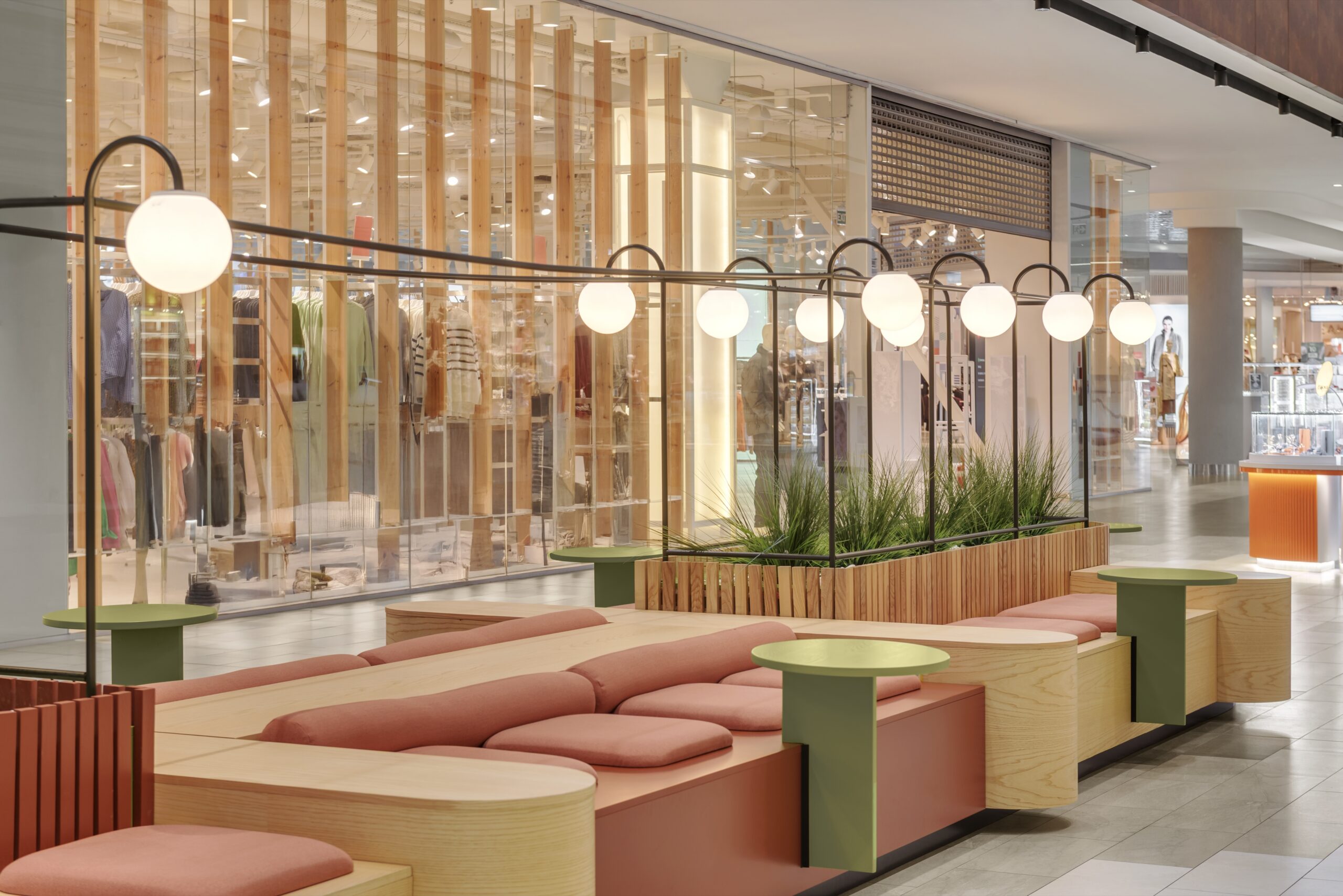 Архітектори loft buro дослідили місце розташування точки — у великому просторі ТЦ — у широких міжбутікових галереях не було місця для відпочинку відвідувачів фізичного і візуального — велика кількість вивісок і зовнішньої реклами, яка кличе покупців поспішати і від якої хочеться затишно сховатися і перепочити.