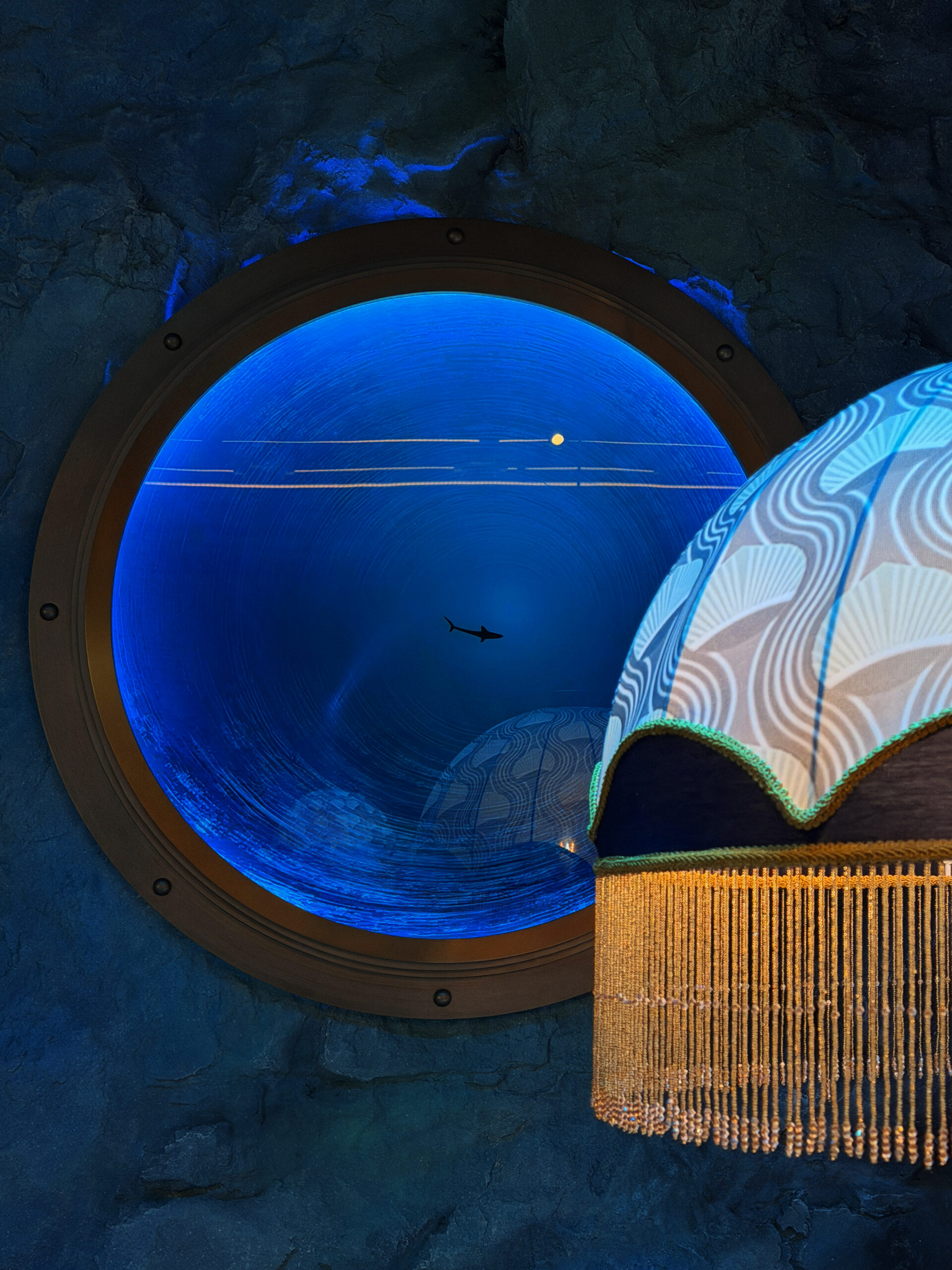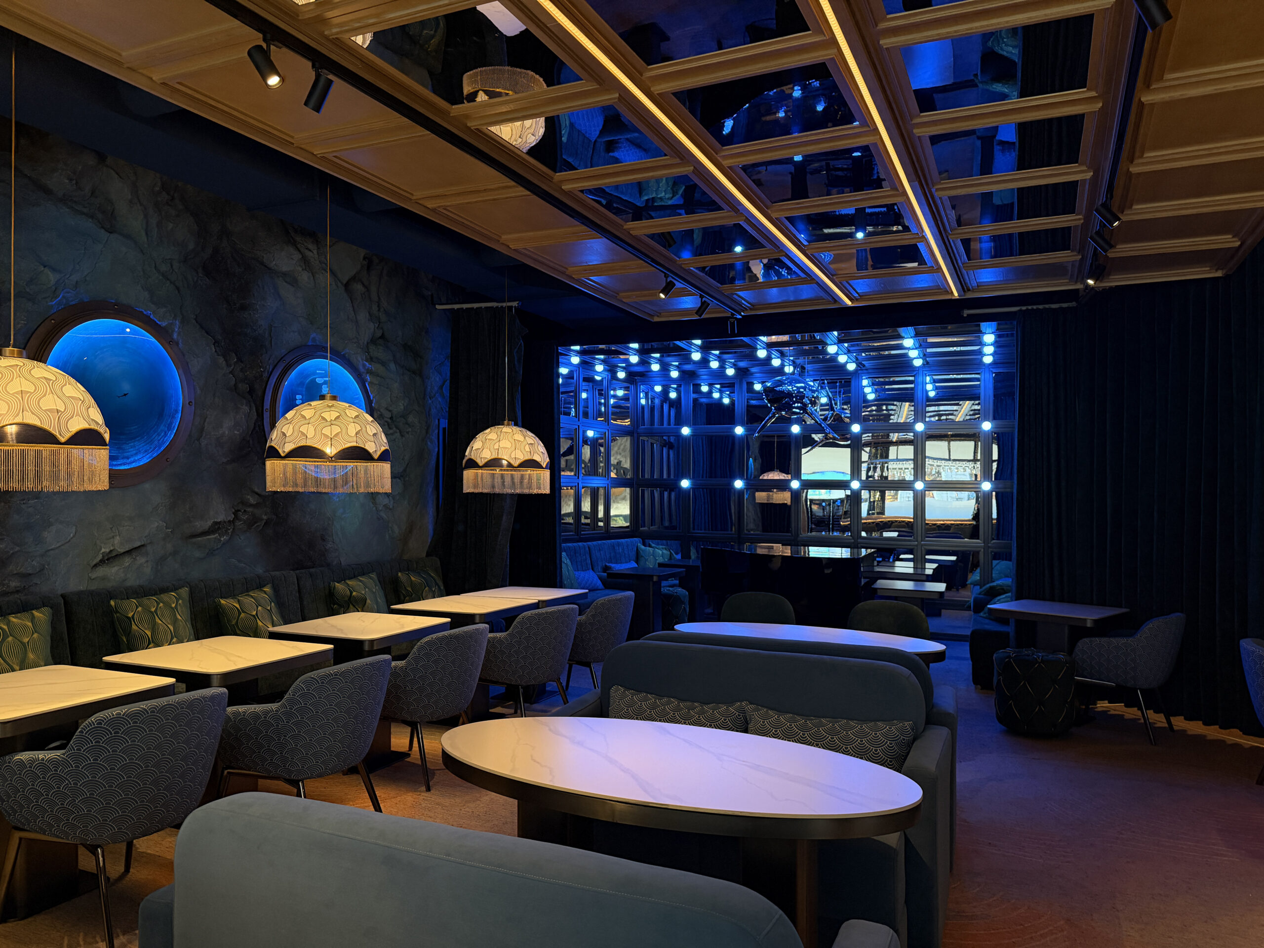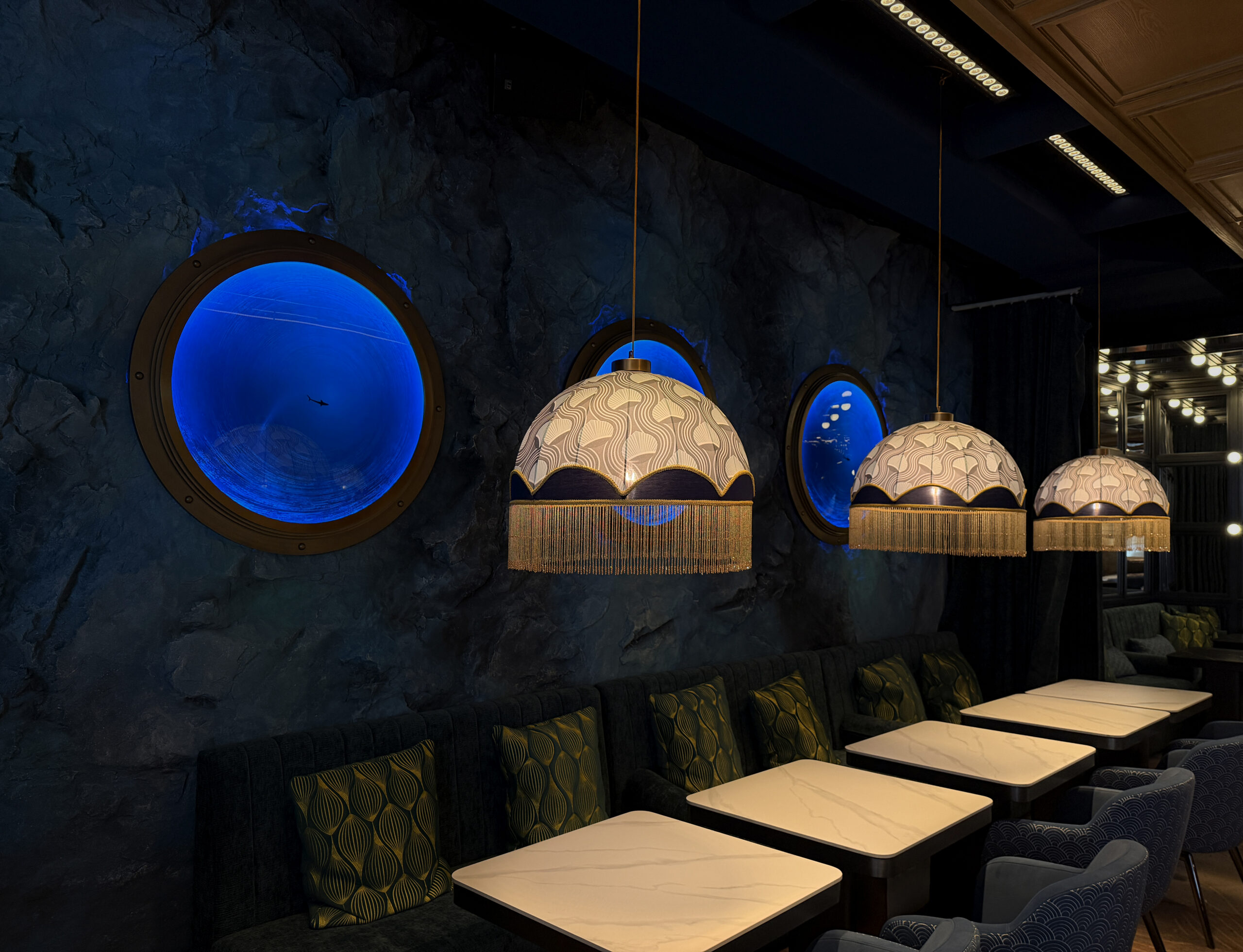 Бічні стіни підтримують морську легенду закладу – з одного боку логотип акули, з протилежного — ілюмінатори — вікна у блакить безмежного океану.