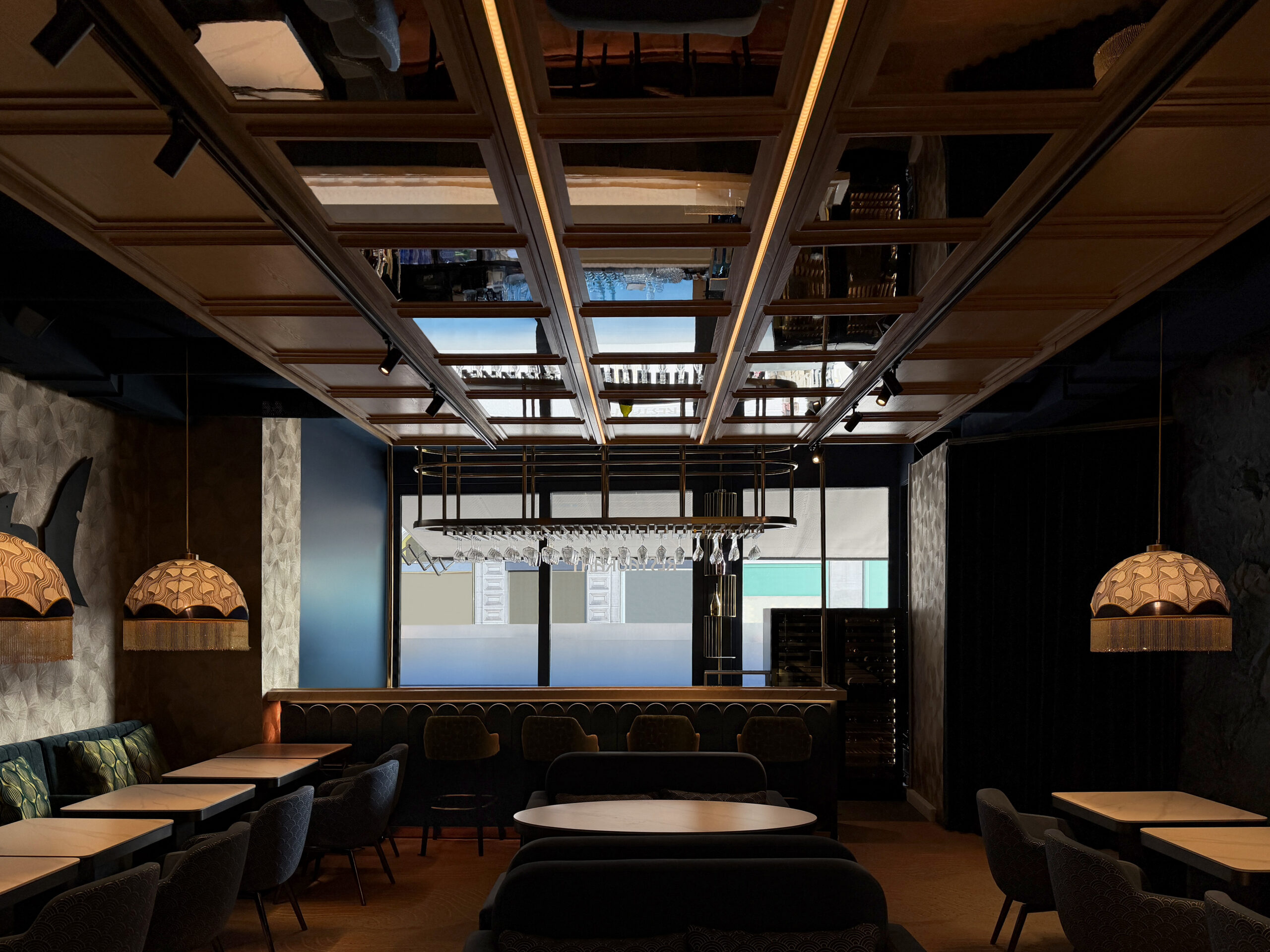 Центральна частина зали акцентована на стелі композицією з дерев’яних та дзеркальних панелей з інтегрованим динамічним освітленням.
