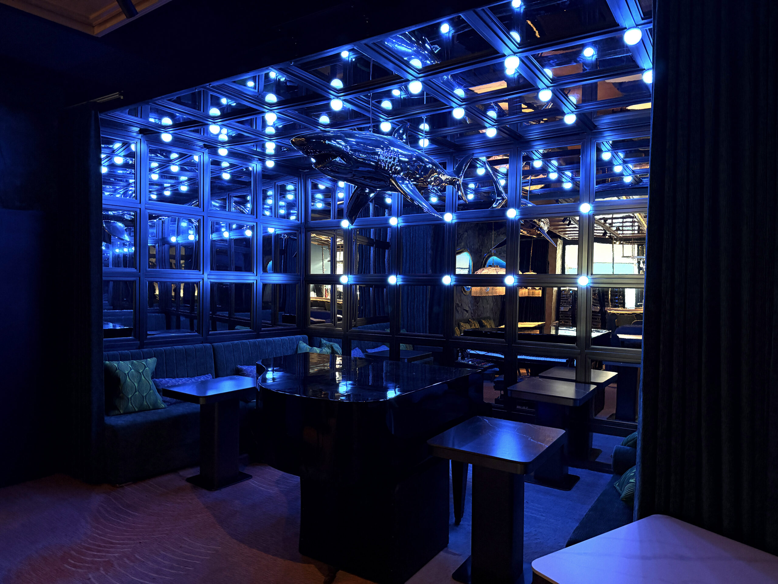 Головна візуальна і планувальна вісь закладу — сцена з символом клубу, дзеркальною акулою.